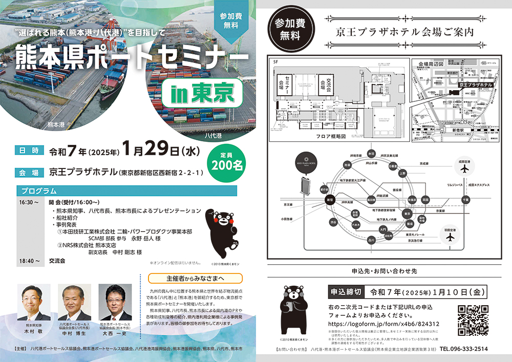 熊本県の八代港と熊本港の利用促進に向けたPRのため、「熊本県ポートセミナーin東京」を令和7年1月29日㈬に京王プラザホテルで開催します。